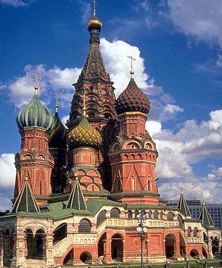 Купола Храма Василия Блаженного. Храм Василия Блаженного (ранее Покровский собор) — шедевр русской архитектуры второй половины 16 в. Вокруг храма была построена обходная галерея, внутри церковь соединялась сводчатыми переходами. Своеобразие облика храма — отсутствие акцентированного главного фасада, внушительное внешнее впечатление при относительно небольшом внутреннем пространстве. Вид на храм со стороны Кремля.