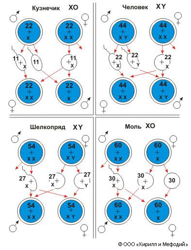 Схема различных типов хромосомного определения пола (двойные кружки — зиготы; одинарные — гаметы; цифры указывают число хромосом).