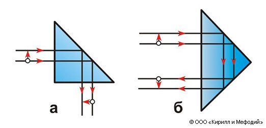 Призмы полного внутреннего отражения: а — поворачивающая призма; б — оборотная призма. Стрелки на линиях, изображающих лучи света, указывают направление этих лучей.