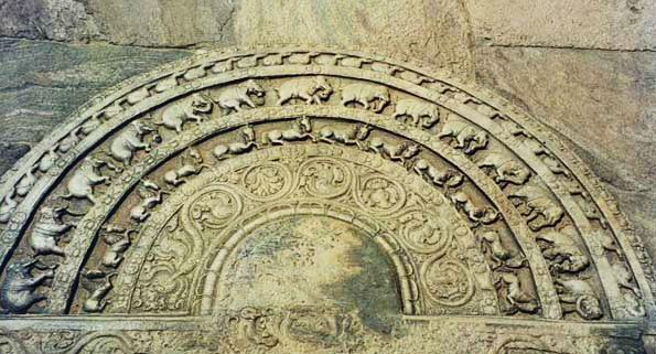 Перед четырьмя входами храма Ватадаге лежат полукруглые плиты с затейливым орнаментом, так называемые «лунные камни». Полоннарува. Шри-Ланка.
