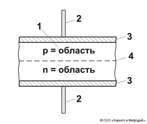 Структурная схема полупроводникового диода с р — n-переходом: 1 — кристалл; 2 — выводы (токоподводы); 3 — электроды (омические контакты); 4 — плоскость р — n-перехода.