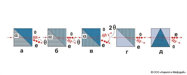Двухлучевые поляризационные призмы: а — призма Рошона; б — призма Сенармона; в — призма Волластона; г — призма из исландского шпата и стекла; д — Аббе. Штриховка указывает направление оптических осей кристаллов в плоскости рисунка. Точки означают, что оптическая ось перпендикулярна плоскости рисунка. Стрелки и точки на лучах указывают направления колебаний электрического вектора.
