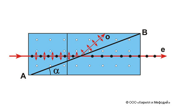 Поляризационная призма Глазебрука. Направления электрических колебаний световых волн указаны на лучах стрелками (колебания происходят в плоскости рисунка) и точками (колебания перпендикулярны плоскости рисунка). O и е — обыкновенный и необыкновенный лучи. При склейке в плоскости АВ канадским бальзамом угол a = 12, 1°, льняным маслом — 14°, глицерином — 17, 3°. Оптические оси кристаллов обеих прямоугольных призм перпендикулярны плоскости рисунка (помечено точками).