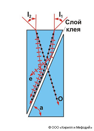 Предельные углы падения I1 и l2 лучей на поляризационную призму Глана — Томсона. Направления электрических колебаний световых волн указаны на лучах стрелками (колебания происходят в плоскости рисунка) и точками (колебания перпендикулярны плоскости рисунка). O и е — обыкновенный и необыкновенный лучи. Клеем служит канадский бальзам (апертура полной поляризации e = l1 + I2 = 27, 5°) или льняное масло (e = 41°). Угол a = 76, 5°.