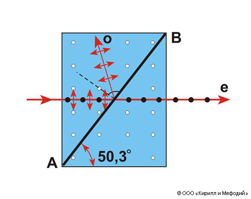 Поляризационная призма Глана. А В — воздушный промежуток. Точки на обеих трехгранных призмах указывают, что их оптические оси перпендикулярны плоскости рисунка. Направления электрических колебаний световых волн указаны на лучах стрелками (колебания происходят в плоскости рисунка) и точками (колебания перпендикулярны плоскости рисунка). O и е — обыкновенный и необыкновенный лучи.