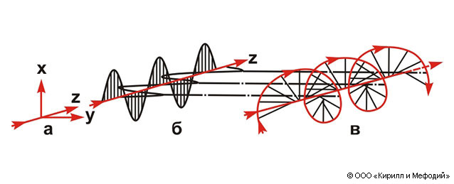 Колебания проекций электрического вектора Е световой волны на взаимно перпендикулярные оси х и у (z — направление распространения волны, перпендикулярное как х, так и у), б и в — моментальные изображения колебаний и соответствующей огибающей концов полного вектора Е в разных точках волны для случая, когда вертикальные (по оси х) колебания на четверть периода (90°) опережают горизонтальные (по оси у). В каждой одной точке конец Е в этом случае описывает окружность. Стрелки на в нанесены лишь для того, чтобы яснее показать вид правого винта. Винтовая поверхность отнюдь не вращается вокруг z при прохождении волны. Напротив, следует представлять, что вся винтовая поверхность как целое, не вращаясь, переносится вдоль z со скоростью волны.