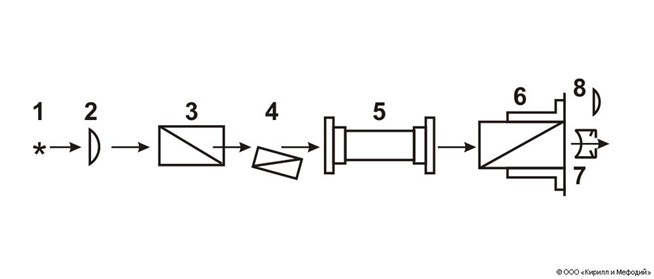 Принципиальная схема полутеневого поляриметра: 1 — источник света; 2 — конденсор; 3—4 — полутеневой поляризатор; 5 — трубка с измеряемым оптически-активным веществом; 6 — анализатор с отсчетным устройством; 7 — зрительная труба; 8 — окуляр отсчетного устройства (например, микроскопа-микрометра).