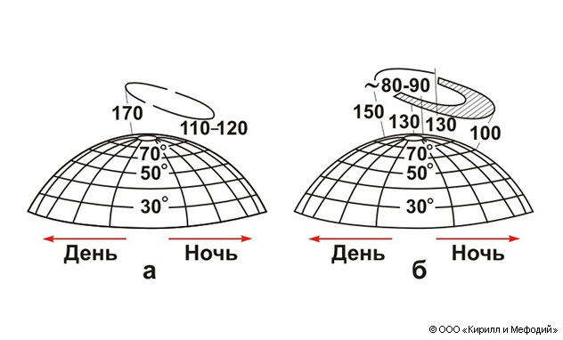 Овалы полярных сияний над поверхностью Земли: а — в виде узкого кольца в магнитно-спокойные периоды и б — в виде заштрихованной области в магнитно-возмущенные периоды. Цифрами указаны высоты овала над поверхностью Земли.