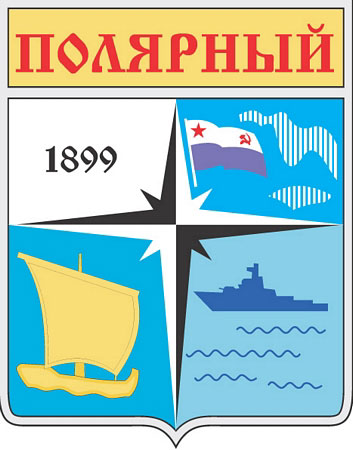 Герб города Полярный, принятый в 1996 году. Щит французской формы разделен розой ветров на четыре части. В первой части указан год основания города, во второй — советский военно-морской флаг и полярное сияние, в третьей — поморская ладья, в четвертой — военный корабль.