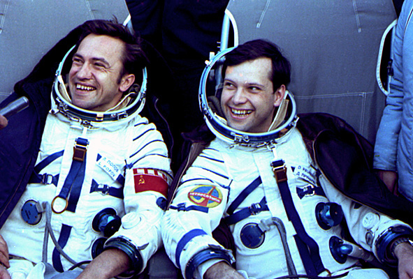 Первые минуты на Земле: международный экипаж в составе Героя Советского Союза летчика-космонавта СССР Л. И. Попова и космонавта-исследователя Румынии Д. Прунариу после завершения программы совместных исследований на борту орбитального комплекса «Салют-6» — «Союз Т-4» — «Союз-40» 22 мая 1981 г.