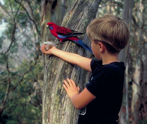 Мальчик кормит малиновую розеллу в заповеднике Маунт-Баффало, Австралия.