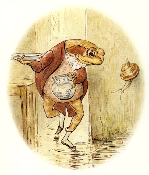 Беатрис Поттер выступала искусным художником своих повестей. Иллюстрация к Повести о «Мистере Джереми-Рыболове», 1906 год.