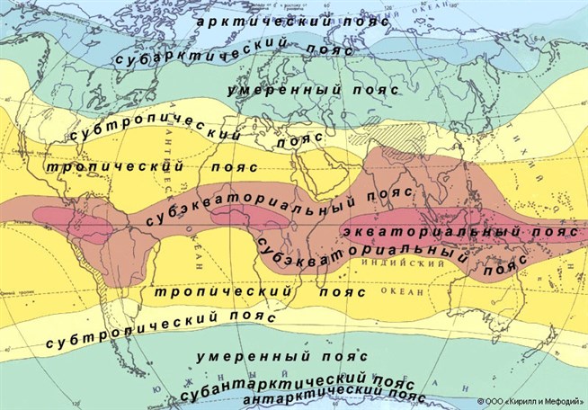 Физико-географические пояса расположены симметрично по отношению к экватору. Карта.