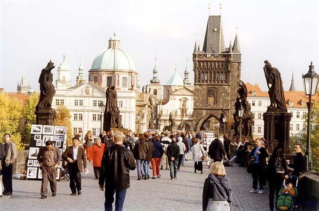 Строительство каменного Карлова моста началось в 1357 году по приказу императора Карла IV Люксембурга. Сооружение из песчаниковых плит, стоящее на 16 быках (длина — 516 м, ширина — 10 м) было закончено в начале 15 века. Мост украшают 30 скульптурных групп в стиле барокко (скульптуры устанавливались на протяжении многих веков). Последняя скульптурная группа Кирилла и Мефодия появилась в 1938 году. На заднем плане: Малостранская предмостная башня.