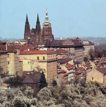 Вид на Пражский Град со стороны Страгова. На протяжении веков Пражский Град являлся резиденцией чешских королей, а затем президента независимой Чехословакии. В настоящее время здесь находится резиденция президента Чешской Республики.