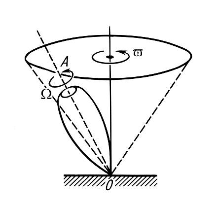 Прецессионное движение волчка (гироскопа) по круговому конусу: ОА — ось собственного вращения волчка с частотой W, w — угловая скорость прецессии.