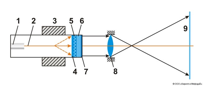 Схема телевизионного проекционного устройства на электроннолучевой трубке с полупроводниковой лазерной мишенью: 1 — электронная пушка; 2 — электронный луч; 3 — отклоняющая система; 4 — зеркало оптического резонатора лазера, полностью отражающее свет; 5 — монокристаллическая пленка полупроводника; 6 — прозрачная подложка из сапфира; 7 — зеркало оптического резонатора, частично пропускающее свет; 8 — проекционный объектив; 9 — светорассеивающий экран.
