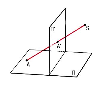 Проекция: S — центр проекции; П' — картинная плоскость; А' — образ точки А, лежащей в плоскости П.