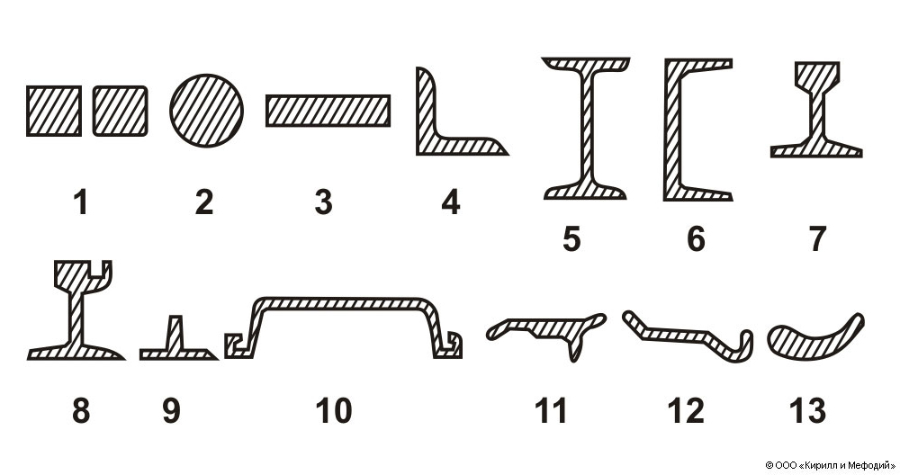 Некоторые профили сортового проката: 1 — квдратный; 2 — круглый; 3 — прямоугольный (полосовой); 4 — угловой; 5 — двутавровый; 6 — швеллерный; 7 — железнодорожный рельс; 8 — трамвайный рельс; 9 — тавровый; 10 — шпунтовый; 11 — полоса для гусениц тракторов; 12 — полоса для ободьев колес грузовых автомобилей; 13 — полоса для турбинных лопаток.