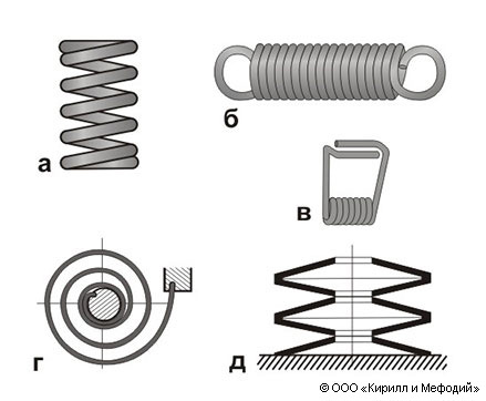 Пружина: а — сжатия; б — растяжения; в — кручения; г — спиральная; д — тарельчатая.