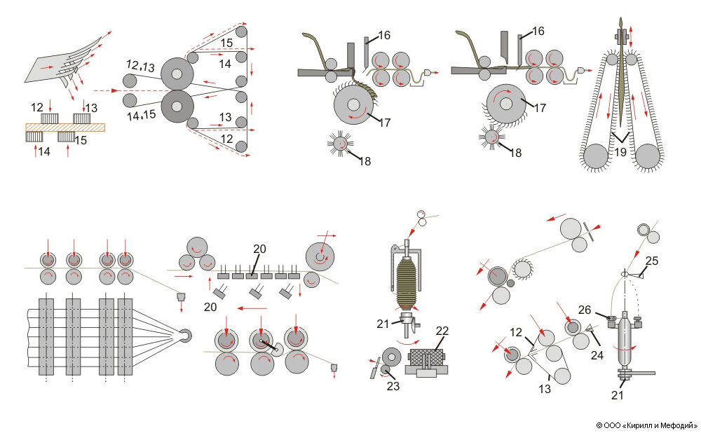 Рабочие органы прядильных машин: 12 — 15 — ремни; 16 — верхний гребень; 17 — гребенный барабанчик; 18 — щетка; 19 — гребенное полотно; 20 — гребень; 21 — веретено; 22 — бобина; 23 — накатный валик; 24 — уплотнитель; 25 — нитепроводник; 26 — бегунок.