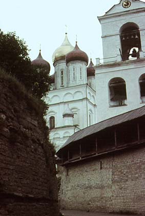 Псков. Троицкий собор. Расположен на территории Псковского кремля (Крома). 1682-99 гг., впоследствии перестраивался в 18 и 19 вв. Колокольня 17-19 вв.