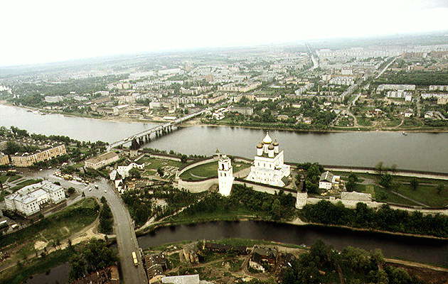 Псков. Вид на реку Великая. Троицкий собор — доминанта псковского кремля..