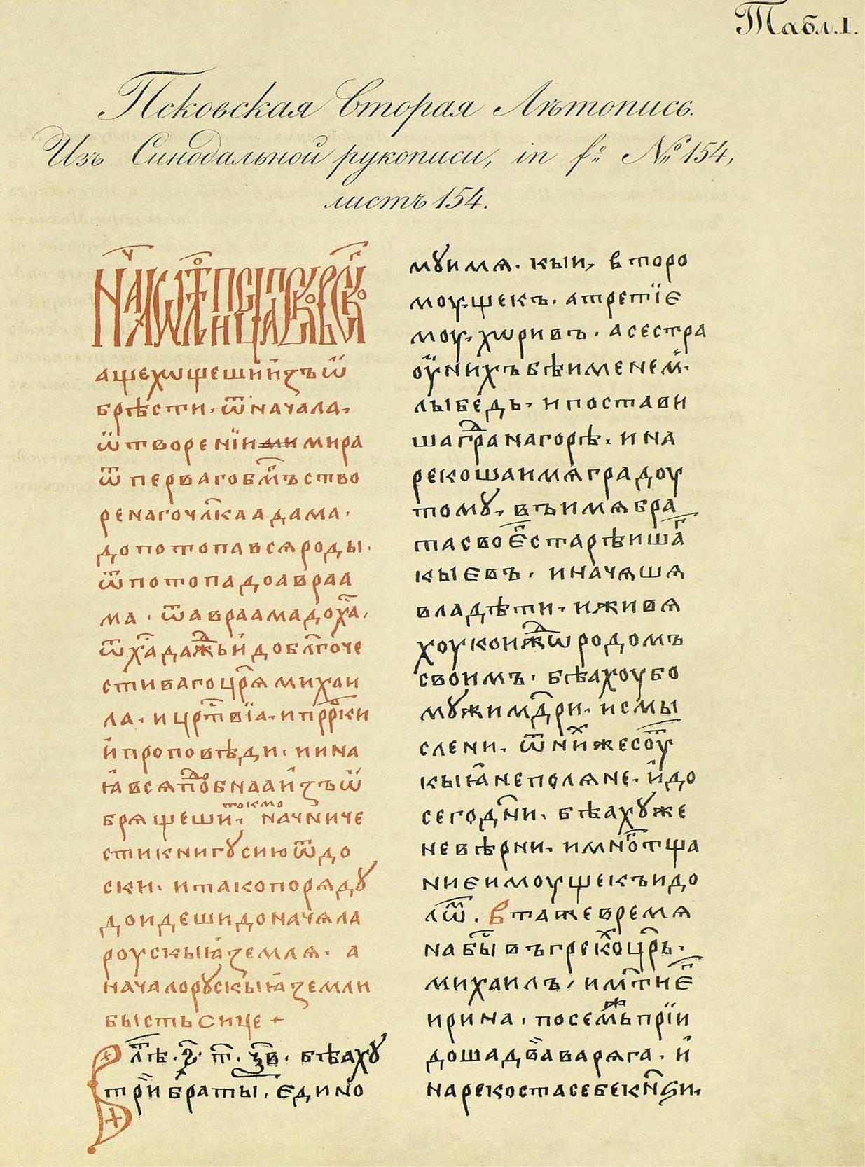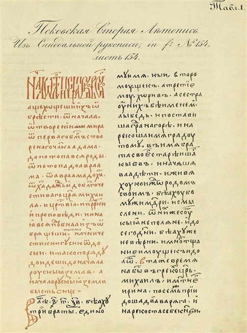 2-я псковская летопись. Факсимильная копия первого листа Синодального списка, датируемого концом XV века. Вступление псковского летописца и фрагмент Начальной Летописи — год 6362 от сотворения мира, основание Киева. Источник: ПСРЛ, Т.5