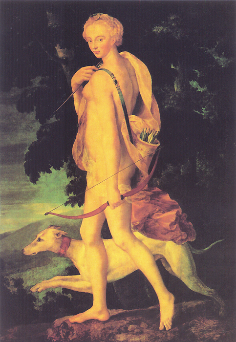 Диана де Паутье в образе Дианы-охотницы. Около 1550 года. Холст. Лувр, Париж. Картина работы неизвестного мастера школы Фонтенбло.