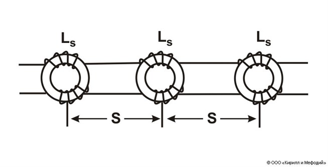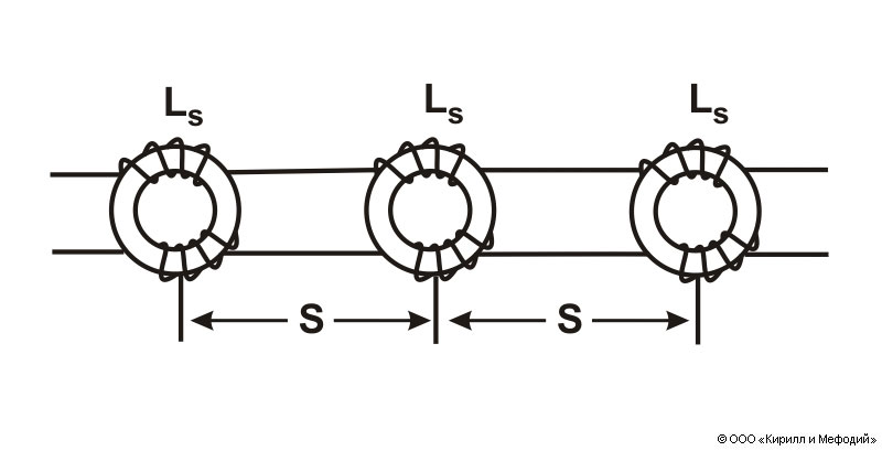Схема пупинизированной кабельной линии: Ls — пупининовская катушка S — шаг пупинизации.