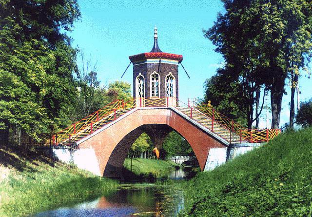 Пушкин. Крестовый мостик в Новом саду. Расположен на пересечении Крестового канала, напротив Большого дворца. Проект постройки моста принадлежит А. Ринальди, но осуществил ее Ч. Камерон. 1776-1779. Всего было построено 5 мостов в подобном стиле.