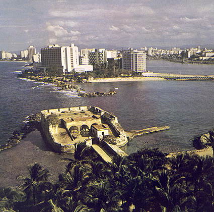 Сан-Хуан. На переднем плане — крепость Сан-Херонимо де Бокерон (16-17 вв.), вдали — новый район Эль-Кондадо.