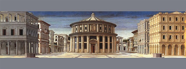 Пьеро делла Франческа. Вид идеального города. Во всем, от простейших форм до мира Космоса, художник Пьеро делла Франческа ощущал единство, суть которого — математика. Хивопись Пьеро делла Франчески тщательно выверена и лаконична, в ней нет ничего случайного. .