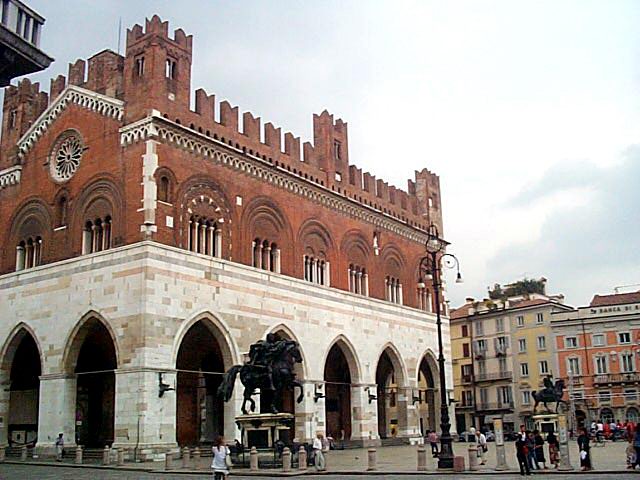 Пьяченца. Дворец Фарнезе, перед дворцом установлены две конные статуи Алессандро (слева) и Раннучио Фарнезе.