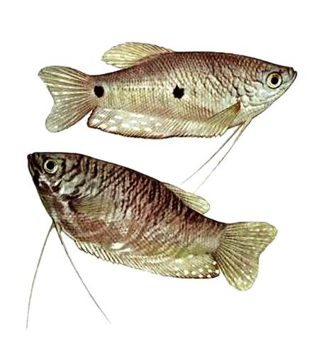 Пятнистый гурами. Вверху самец подвида Trichogaster trichopterus trichopterus, внизу самка гибрида Coshy подвида Trichogaster trichopterus sumatranus.