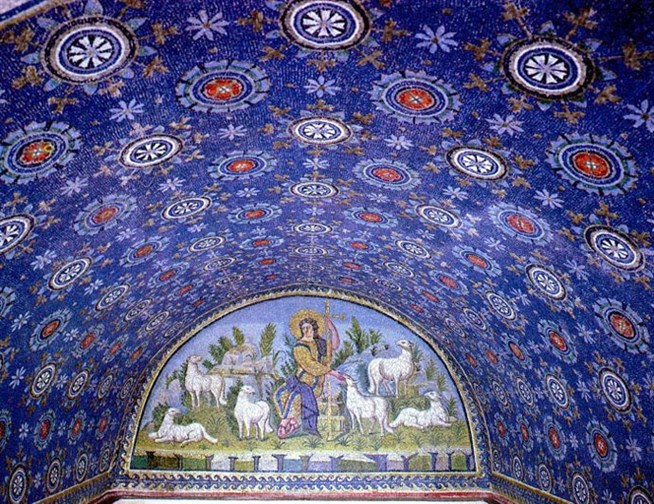 Христос — Добрый Пастырь. Мозаика в люнете мавзолея Галлы Плацидии. 5 в. Равенна, Италия.