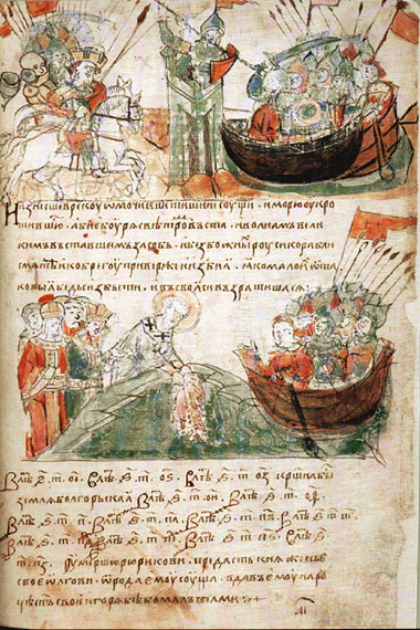 «Царь же с трудом вошел в город и всю ночь молился с патриархом Фотием в церкви Святой Богородицы во Влахерне, и вынесли они с песнями Божественную ризу Святой Богородицы (конец предыдущей страницы) (миниатюра), и смочили в море ее полу. Была в это время тишина и море было спокойно, но тут внезапно поднялась буря с ветром, и снова встали огромные волны, разметало корабли безбожных русских, и прибило их к берегу, и переломало, так что немногим из них удалось избегнуть этой беды и вернуться домой. (миниатюра) В год 6375 (867). В год 6376 (868). Начал царствовать Василий. В год 6377 (869). Крещена была вся земля Болгарская. В год 6378 (870). В год 6379 (871). В год 6380 (872). В год 6381 (873). В год 6382 (874). В год 6383 (875). В год 6384 (876). В год 6385 (877). В год 6386 (878). В год 6387 (879). Умер Рюрик и передал княжение свое Олегу - родичу своему, отдав ему на руки сына Игоря, ибо был тот еще очень мал».