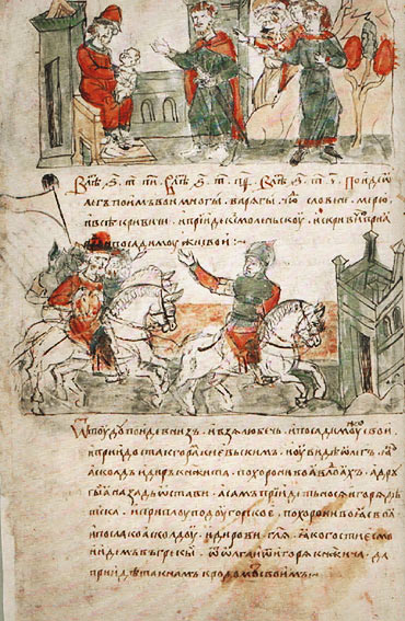 Миниатюра. «В год 6388 (880). В год 6389 (881). В год 6390 (882). Выступил в поход Олег, взяв с собою много воинов: варягов, чудь, словен, мерю, весь, кривичей, и пришел к Смоленску с кривичами, и принял власть в городе, и посадил в нем своего мужа. Оттуда отправился вниз, и взял Любеч, и также посадил мужа своего. (миниатюра) И пришли к горам Киевским, и узнал Олег, что княжат тут Аскольд и Дир. Спрятал он одних воинов в ладьях, а других оставил позади, и сам приступил, неся младенца Игоря. И подплыл к Угорской горе, спрятав своих воинов, и послал к Аскольду и Диру, говоря им, что-де «мы купцы, идем в Греки от Олега и княжича Игоря. Придите к нам, к родичам своим».