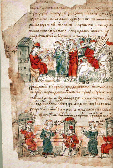 «В год 6370 (862). Прибыли варяги из-за море, и не дали им дани, и начали сами собой владеть, и не было среди них правды, и встал род на род, и была у них усобица, и стали (конец предыдущей страницы) воевать друг с другом. И сказали себе: «Поищем себе князя, который бы владел нами и судил по праву». И пошли за море к варягам, к руси. Те варяги назывались русью, как другие называются шведы, а иные норманны и англы, а еще иные готландцы, — вот так и эти. Сказали руси чудь, словене, кривичи и весь: «Земля наша велика и обильна, а порядка в ней нет. Приходите княжить и владеть нами». (миниатюра) И избрались трое братьев со своими родам, и взяли с собой всю русь, и пришли, и сел старший, Рюрик, в Новгороде, а другой — на Белоозере, а третий, Трувор, — в Изборске. И от тех варягов прозвалась Русская земля. Новгородцы же - те люди от варяжского рода, а прежде были словене». Миниатюра.