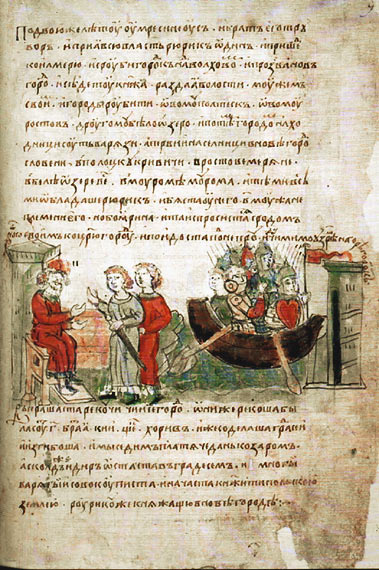«Через два же года умерли Синеус и брат его Трувор. И принял всю власть один Рюрик, и стал раздавать мужам своим города — тому Полоцк, этому Ростов, другому Белоозеро. Варяги в этих городах — находники, а коренное население в Новгороде — словене, в Полоцке — кривичи, в Ростове — меря, в Белоозере — весь, в Муроме — мурома, и над теми всеми властвовал Рюрик. И было у него два мужа, не родственники его, но бояре, и отпросились они в Царьград со своим родом. И отправились по Днепру, и когда плыли мимо, то увидели на горе небольшой город. (миниатюра) И спросили: «Чей это городок?». Те же ответили: «Были три брата, Кий, Щек и Хорив, которые построили городок этот и сгинули, а мы тут сидим, их потомки, и платим дань хазарам». Аскольд же и Дир остались в этом городе, собрали у себя много варягов и стали владеть землею полян. Рюрик же княжил в Новгороде».