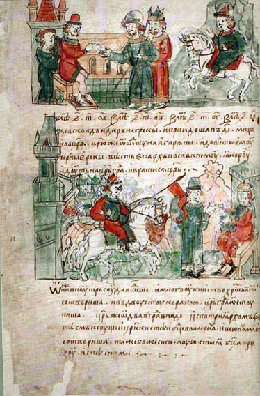Миниатюра. «В год 6371 (863). В год 6372 (864). В год 6373 (865). В год 6374 (866). Пошли Аскольд и Дир войной на греков и пришли к ним в 14-й год царствования Михаила. Царь же был в это время в походе на агарян, дошел уже до Черной реки, когда епарх прислал ему весть, что Русь идет походом на Царьград, и возвратился царь. (миниатюра) Эти же вошли внутрь Суда, множество христиан убили и осадили Царьград двумястами кораблей. Царь же с трудом вошел в город и всю ночь молился с патриархом Фотием в церкви Святой Богородицы во Влахерне, и вынесли они с песнями Божественную ризу Святой Богородицы (начало следующей страницы), и смочили в море ее полу».