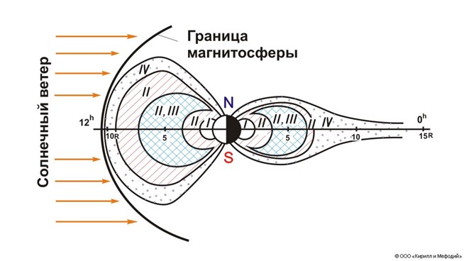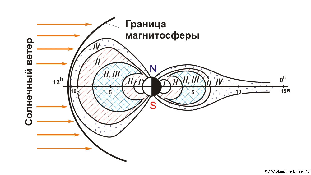 Структура радиационных поясов Земли (сечение соответствует полуденному меридиану): I — внутренний пояс: II — пояс протонов малых энергий; III — внешний пояс; IV — зона квазизахвата.