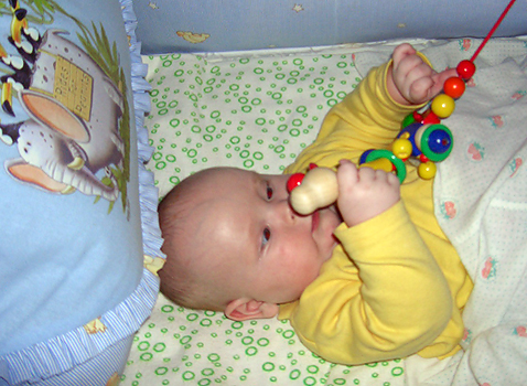 Ребенок в возрасте 4-х с небольшим месяцев охотно играет в кроватке с привязанными игрушками.
