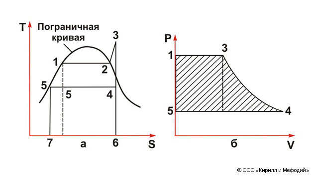 Цикл Ранкина в координатах: а — температура T, энтропия S; б — давление P, объем V; 1—2 — испарение рабочего тела при подводе теплоты; 2—3 — перегрев пара; 3—4 — адиабатическое расширение пара; 4—5 — конденсация пара; 5—1 — подогрев воды.