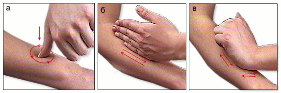 Растирание: а) большим пальцем с элементами давления; б) боковое ладонное трение (пиление); в) основанием ладони.