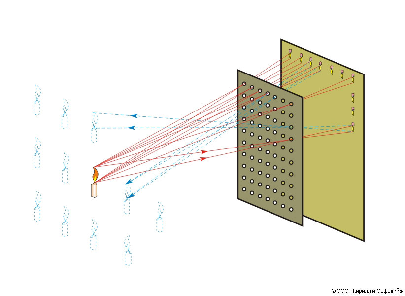 При обратном ходе лучей света от каждого элементарного изображения, полученного в результате анализирования, через многие смежные элементы растра возникает множество подобных друг другу пространственных изображений объекта (интегрирующее, или синтезирующее, свойство растровой оптической системы).