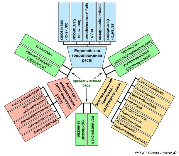 Схема антропологического состава народов мира (малые расы, выделяемые внутри больших и отличающиеся друг от друга не столь существенными признаками).