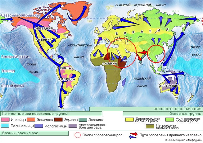 Распространение человеческих рас на Земле. Географическая карта.