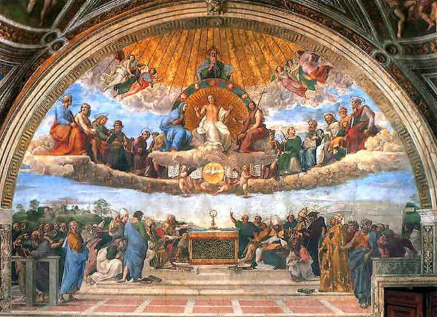 Рафаэль Санти. «Диспута». Станца делла Сеньятура. Ватикан. Рим. В «Диспуте» Рафаэль расположил по двум дугам две группы - нижнюю, изображающую земную «воинствующую» церковь, и верхнюю, прославляющую церковь «небесную», «торжествующую».