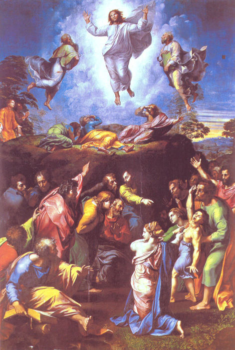 Рафаэль Санти. Преображение. 1517-1520 годы. Дерево, темпера, масло. Пинакотека, Ватикан. В картине изображены собственно Преображение Христово и последовавший за этим спор апостолов с фарисеями.